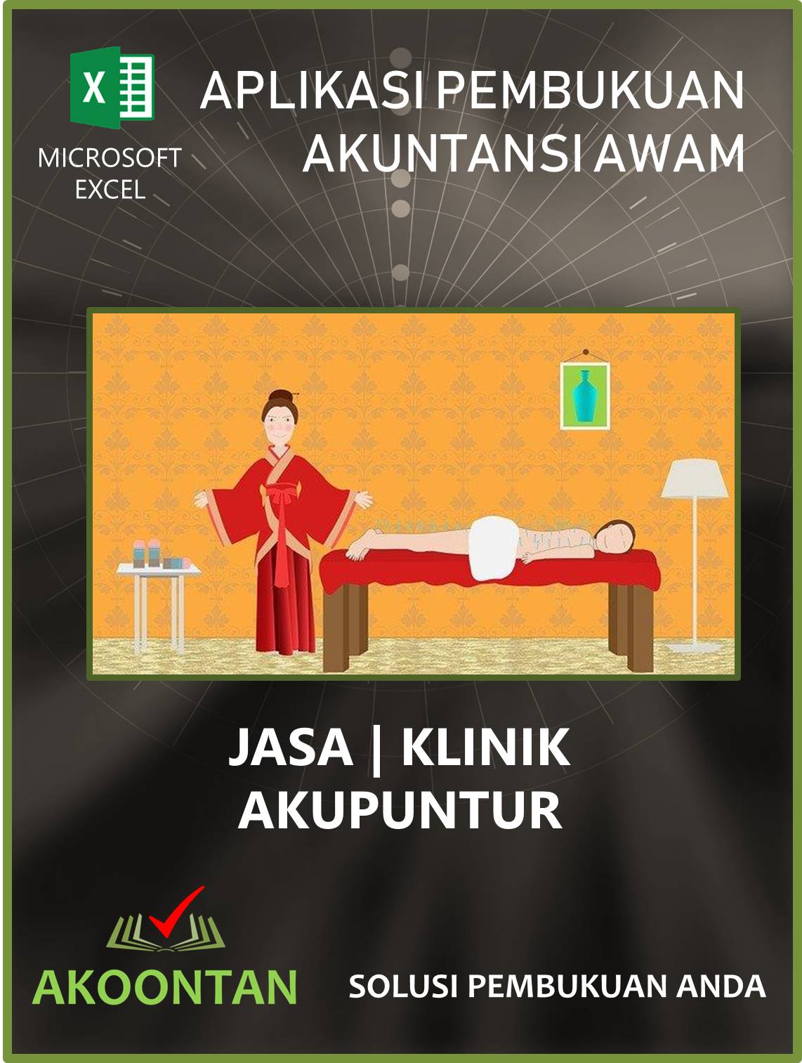 Excel Akuntansi Jasa Akupuntur adalah aplikasi Excel untuk melakukan pembukuan dan pembuatan laporan keuangan khusus untuk jenis jasa pengobatan tradisional, yaitu akupuntur. Jenis pengobatan ini berasal dari Cina dan menggunakan jarum khusus akupuntur sebagai media untuk melancarkan peredaran darah yang menjadi penyebab sakit.